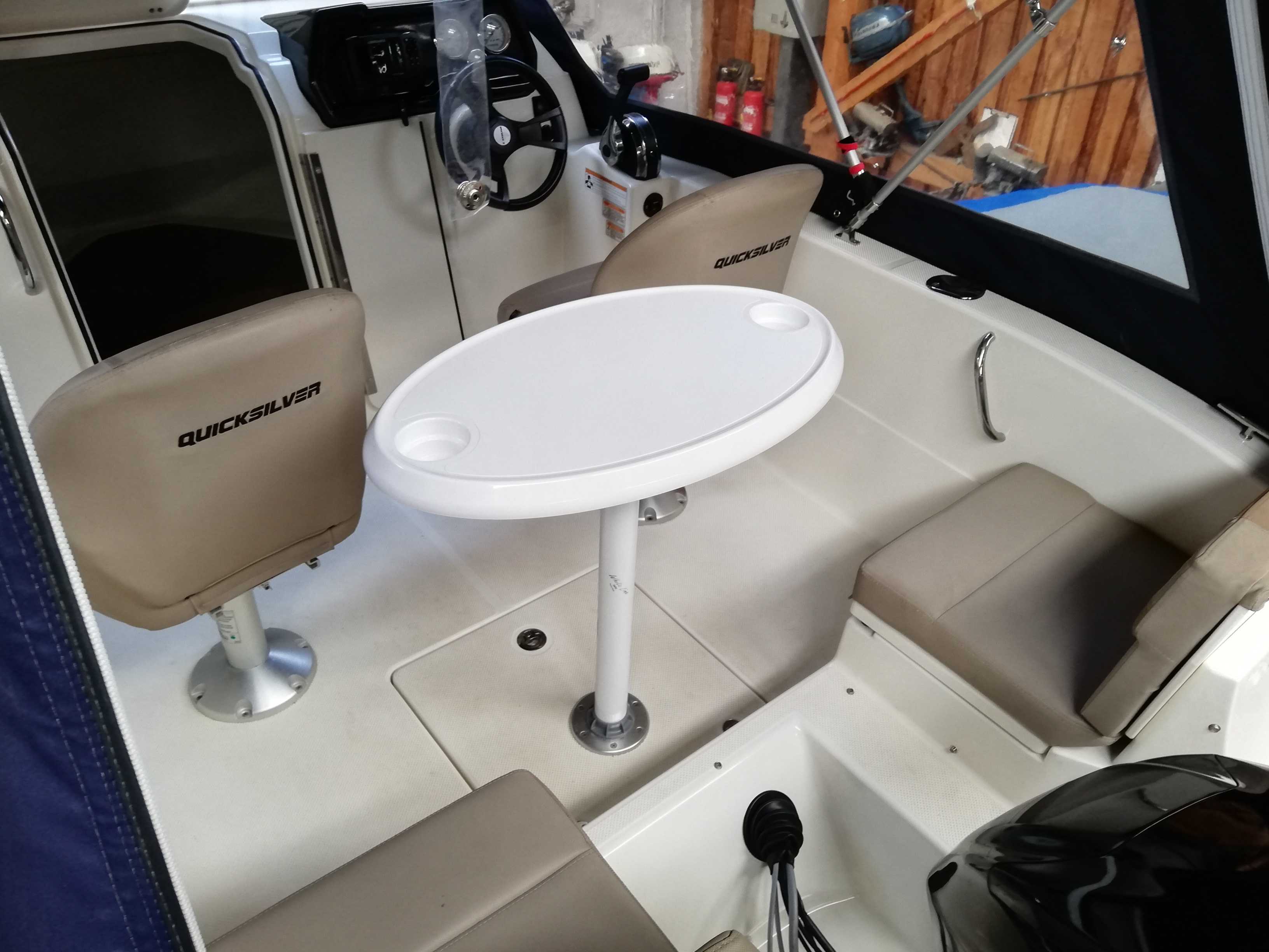 Der praktische Plichttisch lädt zum Frühstück auf dem Wasser ein, während die Badeleiter den Sprung ins kühle Nass besonders einfach macht. Für Angler bietet das Boot ideale Voraussetzungen: übersichtlich, stabil und mit moderner Technik wie dem Lowrance Fishfinder ausgestattet.